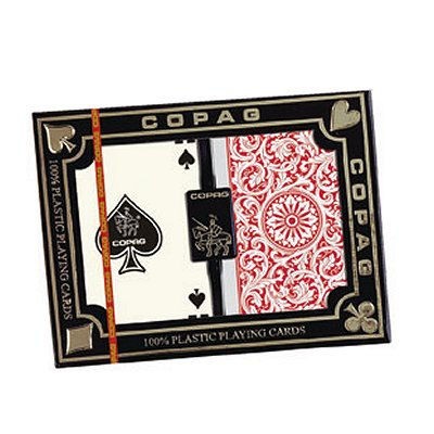 Custodia Protettiva Inclusa: Il set doppio viene fornito in una robusta scatola in plastica rigida, ideale per il trasporto e la conservazione ottimale dei due mazzi (solitamente in colori contrastanti come Rosso/Blu o Oro/Nero).