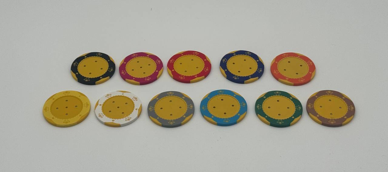 Le fiches Modello Crown sono tra le più apprezzate dai professionisti per il loro design regale e la qualità costruttiva superiore. Realizzate in Clay (argilla pressata) con inserto metallico interno da 14 gr offrono una sensazione di solidità e un feedback sonoro identico a quello dei migliori casinò internazionali.